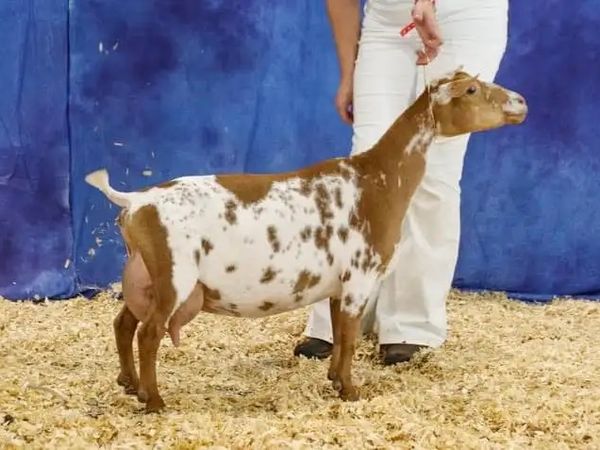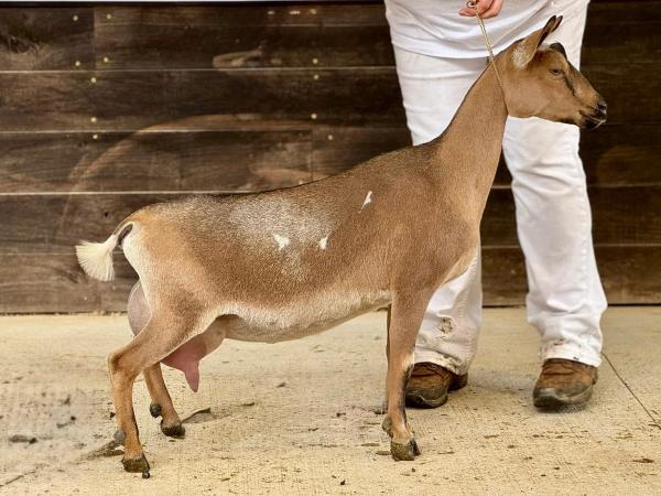 Gravity (CH Moon Station Kari VEEE 90 x GCH Wood Bridge Farm Count on Me *B) received a LA score of GVGV86 as a yearling FF. She was 20th place yearling milker at 2025 Nationals. At her first show in milk, she earned 1st place yearling milker in both rings, and in her next show earned 1st in 3 rings and 2nd in another.